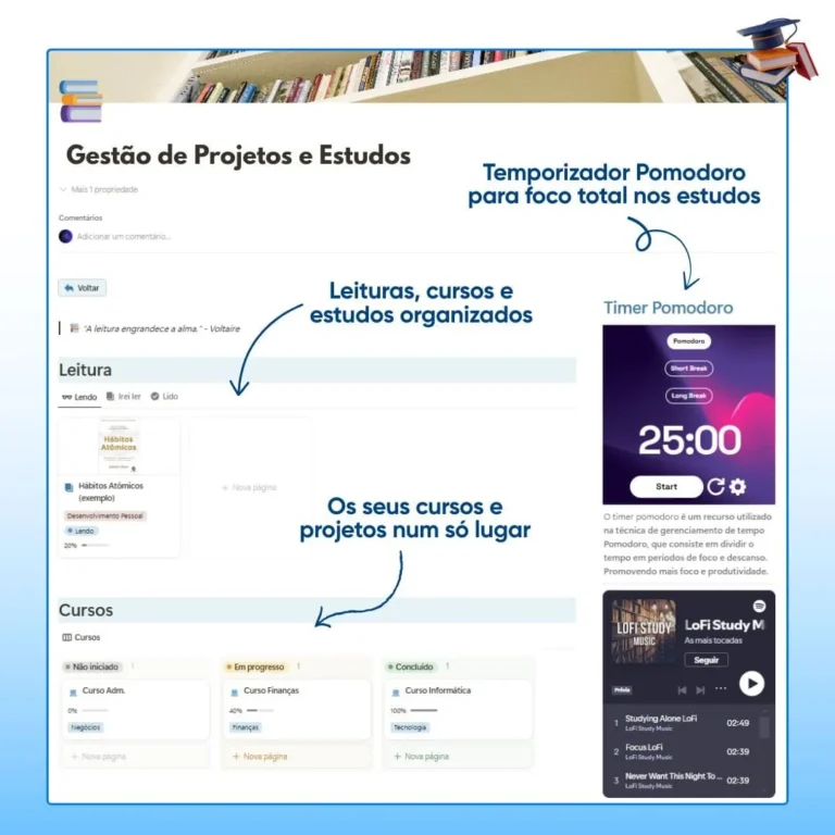 Organize os seus estudos, livros e cursos num só local e mantenha o foco na hora de estudar.